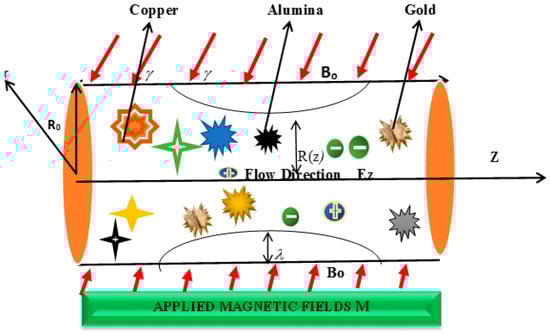 Furthermore, the magnetic field, denoted by B0, is applied at an inclination angle, γ, relative to the axial direction, z (measured counterclockwise from the positive z-axis) in the r-z plane to account for geometric variations in real arterial environments. A critical consequence of this phenomenon is that a positive gamma induces a negative component in the axial velocity of the nanofluid. This effect arises from the orientation of the Lorentz force, which acts as a resistive force opposing the axial flow when the magnetic field is inclined. It is imperative to elucidate that no secondary magnetic field is taken into account; that is to say, there is an absence of an opposing magnetic field from the opposite direction. Instead, the magnetic field strength, denoted by B0, is characterized by a single inclination angle, denoted by γ, which directly determines the sign of the magnetic force term in the axial momentum equation. The combined influence of these parameters (magnetic field, coordinates, and inclination angle) on the overall fluid flow dynamics is visually illustrated in Figure 1.