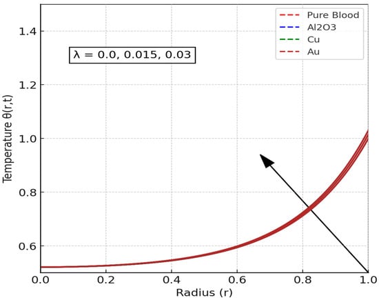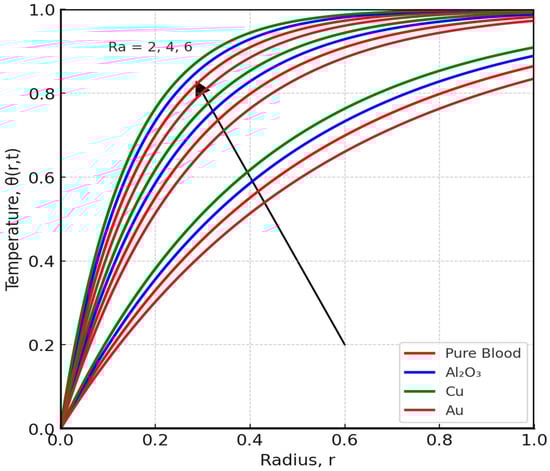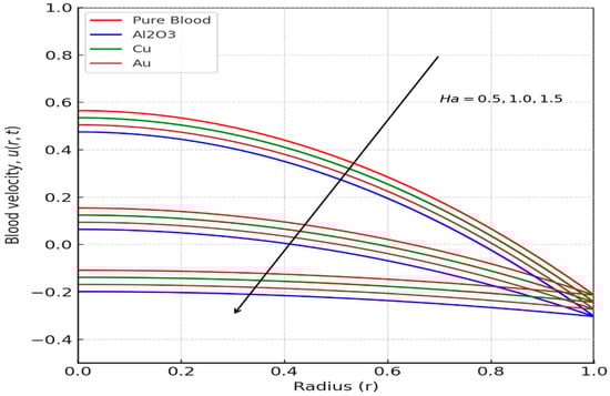 The accuracy of the Concentrated Matrix-Exponential (CME) inversion was checked by varying the number N of exponential terms from 10 to 60. The L2-error norm decreased monotonically, reaching <10−3 for N ≥ 33, confirming convergence. A comparison with an explicit finite-difference time stepping solution for a representative transient case yielded an RMSE = 2.8 × 10−3, demonstrating the reliability of the CME approach. Ganji et al. [] carried out an analysis of heat transfer in magnetized flow inside vertical channels, using Python for computational processes. This study provides support for the computational framework adopted in the current model. In this section, we present the numerical solutions that match the semi-analytical results for three key parameters of the ternary nanofluid: blood flow velocity, concentration, and temperature profiles. These numerical solutions were derived by solving the governing equations with the Python programming language, which allows for efficient calculation of the inverse Laplace transforms for the model. The effects of the main key factors on the fluid dynamics are shown in graphical form under different physical parameters. During the computation, the properties of gold (Au), copper (Cu), and aluminum oxide (Al2O3) are all incorporated. To verify the proposed methodology, we compared the axial velocity profiles obtained in this study with the results from previous research [,]. This comparative analysis shows consistency across all radial positions, and low Mean Squared Error (MSE) values serve as evidence of this consistency, thereby confirming the accuracy of the numerical scheme. The validity of the velocity distribution results is demonstrated in Table 2. Additionally, to ensure consistency, the numerical findings were compared with those from a previous study, using specific parameter values and .