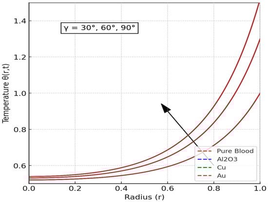 In recent years, advancements in nanotechnology have led to new possibilities for modulating blood flow characteristics. The development of hybrid and ternary nanofluids is a particularly promising area of research in this field []. These nanofluids, which consist of a base fluid (e.g., blood) dispersed with nanoparticles (such as gold (Au), aluminum oxide (Al2O3), and copper (Cu)), exhibit enhanced thermophysical properties compared to pure blood. More specifically, they demonstrate superior thermal conductivity, accelerated heat transfer rates, and improved mass diffusion capabilities.