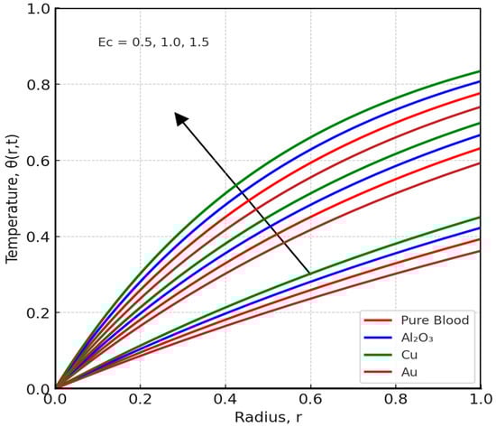 Joule heating and viscous dissipation are two important ways heat moves in biofluids. Joule heating is the thermal energy that is generated when blood vessels block the flow of electric current. Viscous dissipation is caused by the frictional forces between the flowing blood and the arterial wall. Research by Wang and Popel [] shows that when these two mechanisms interact, it changes both the temperature distribution within the fluid and the dynamic features of blood flow. These effects are very important for the body’s natural processes, like blood flow and body temperature control. In a related engineering context, Sharma and Sinha [] investigated the influence of Joule heating on unsteady magnetohydrodynamic (MHD) flow over a stretching sheet in a porous medium. They used the fourth-order Runge–Kutta method for analysis. Their findings showed that these thermal effects cause significant changes in flow properties, like skin friction and the Nusselt number.