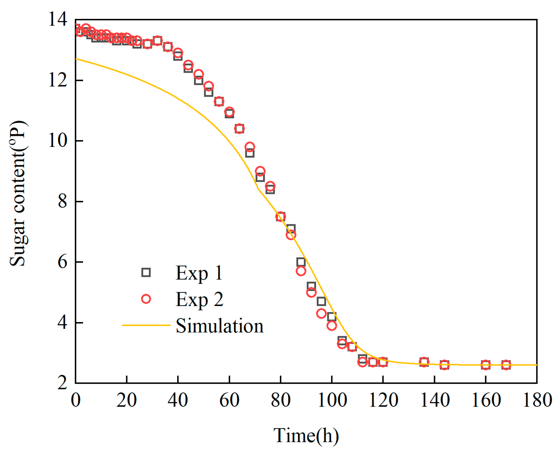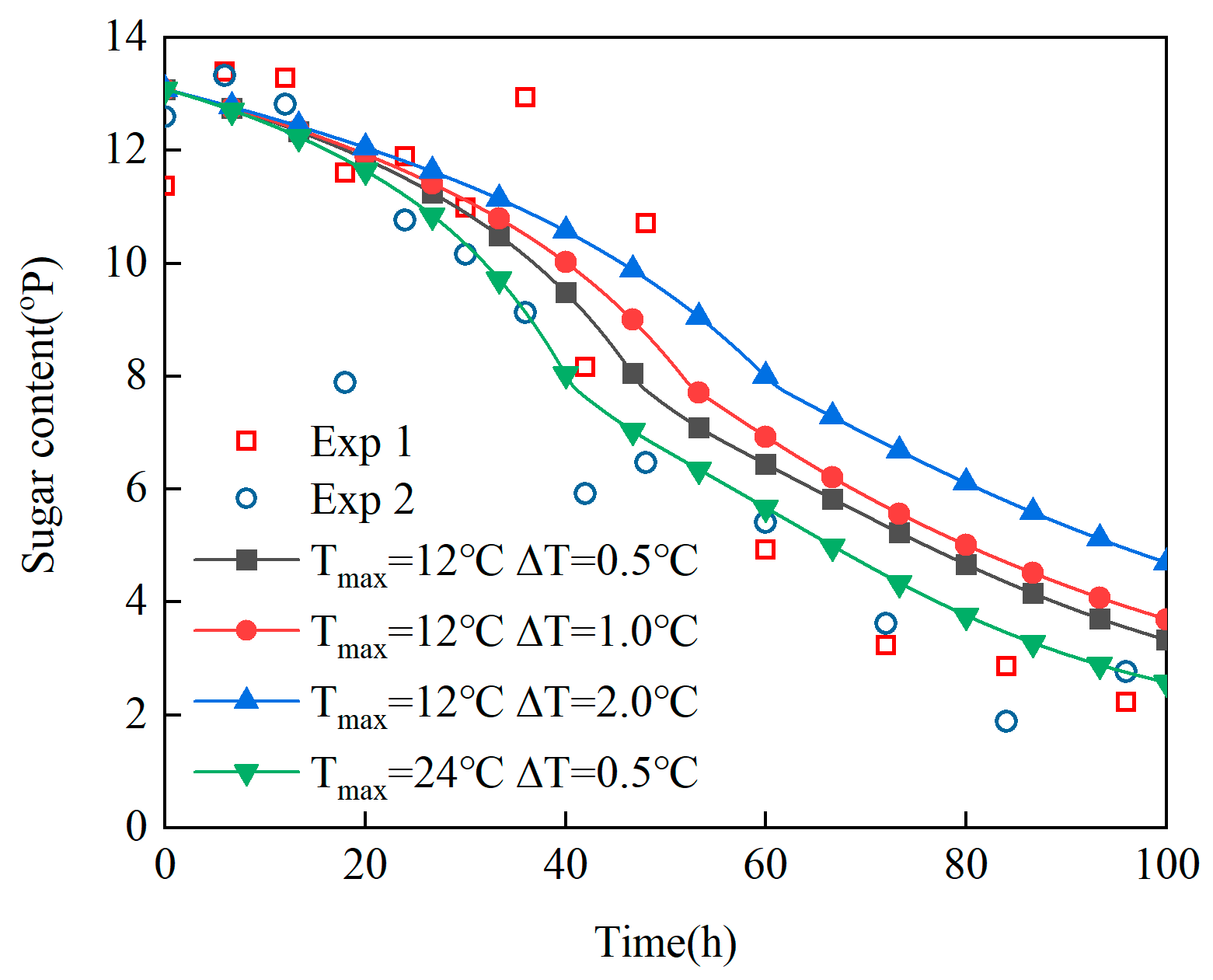 Revelation of Fermentation Process Dynamic Characteristics: The results of lab-scale experiments show that during the uncontrolled fermentation stages, parameters such as temperature, alcohol concentration, sugar content, and yeast concentration exhibit distinct temporal evolution patterns. Notably, the increase in temperature follows an approximately quadratic function curve, which indicates that the rate of fermentation reactions progresses in a relatively linear manner over time. Moreover, the findings from industrial-scale simulations demonstrate a high degree of consistency between the average temperature changes observed during the primary fermentation process and the corresponding experimental records. It is also observed that variations in the parameters of the control algorithm have a significant impact on both the temperature distribution and flow patterns within the fermenter. Larger temperature discrepancies lead to more pronounced convective effects and complex temperature profiles. A central finding is that this behavior is governed by a fundamental symmetry-breaking mechanism, where asymmetric cooling disrupts the thermal uniformity of the geometrically symmetric fermenter.