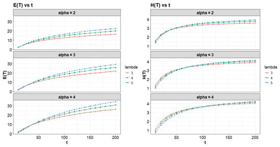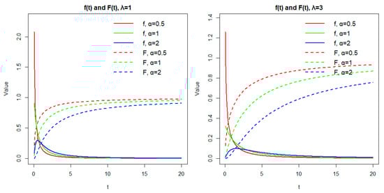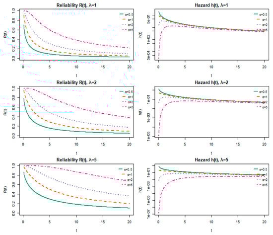 The reliability function R(t) and hazard rate h(t) are used to describe the lifetime behavior of the proposed model, allowing us to analyze how the system’s survival probability and risk of failure evolve over time. Figure 2 illustrates and for different values of the parameters. Figure 3 illustrates the reliability function and hazard rate and how survival and risk evolve over time with different values of parameters α (shape parameter) and λ (scale parameter). The curve declines from unity toward zero, with a steeper descent when the shape parameter α exceeds unity. The hazard curve exhibits a decreasing profile over time for α below unity, remains flat when α equals unity, and rises when α exceeds unity.