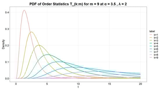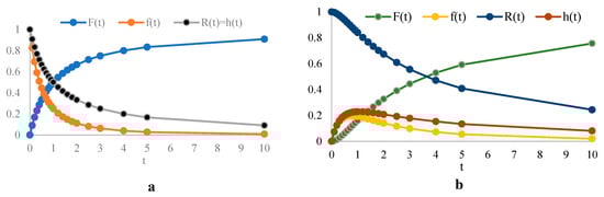where and are the density and reliability functions for this distribution. Substituting the density and reliability functions of our model from Equations (3) and (6), for we get the following form: