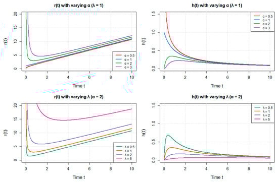 Illustration of the effects of parameters α and λ on reliability function R(t), hazard rate h(t), and mean residual life r(t).