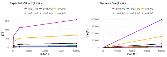 In this section, we present a numerical approximation of the integrals for , and as the upper limit c increases, for fixed values of the parameters α and λ. Table 2 presents numerical approximation for the behavior of the mean and variance of the UG-EM model at cutoff c. Also, graphical illustration is presented in Figure 7.