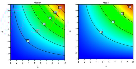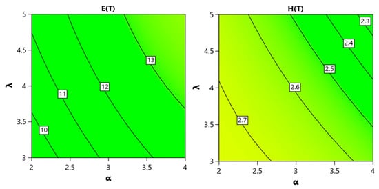 Figure 5 illustrates how the reliability function , hazard rate , and mean residual life vary with parameters α and λ. As shown, the system exhibits clear parametric sensitivity, with noticeable gradients in all three plots. In particular, the reliability decreases when increasing both parameters, while the hazard rate and residual life respond nonlinearly, indicating the complex behavior of the model under different parameter regimes.