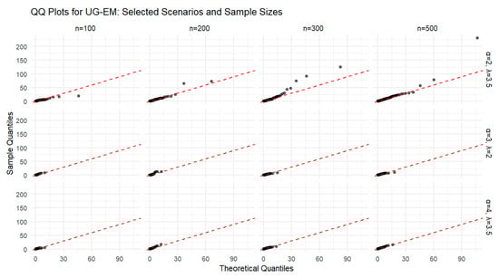 QQ plots for the UG-EM distribution for selected parameter values (α and λ) across different sample sizes (n = 100, 200, 300, 500).