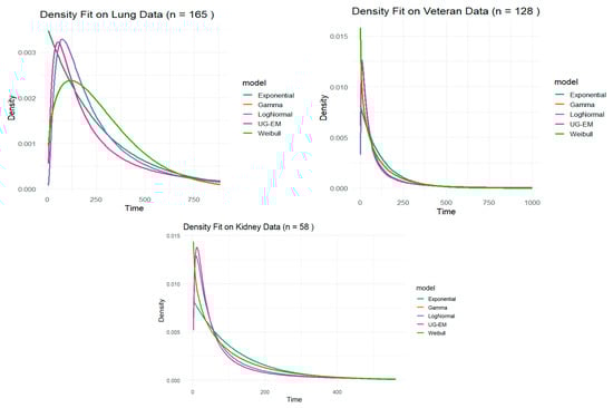 In the following, a graphical comparison of the Exponential, Weibull, Log-normal, and UG-EM models based on Lung, Veteran, and Kidney data is presented in Figure 13.