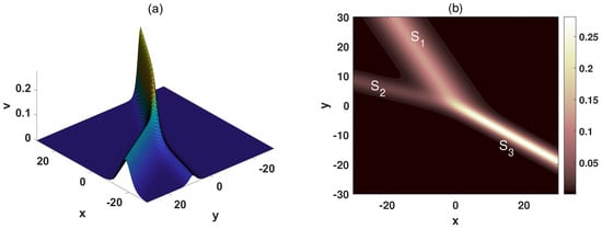the Y-shaped soliton is depicted in Figure 3. The trajectories, amplitudes, and velocities corresponding to each arm of the Y-type soliton are presented in Table 2.