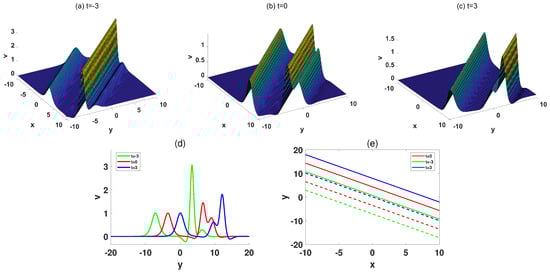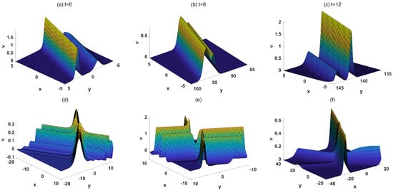 The interactions between transformed waves and solitons are presented in Figure 4a–e. Figure 4a–c depict the interaction between a quasi-soliton and a soliton at different moments. A quasi-soliton and a soliton remain parallel during their propagation, traveling along the line . It can be observed that the quasi-soliton moves faster than the soliton. The quasi-soliton continuously approaches the soliton and eventually overtakes it. The interactions between a multi-peak soliton/M-shaped soliton and a soliton are shown in Figure 4d and Figure 4e, respectively. With the condition Equation (13), the interaction between a Y-shaped soliton and a soliton is obtained (Figure 4f).