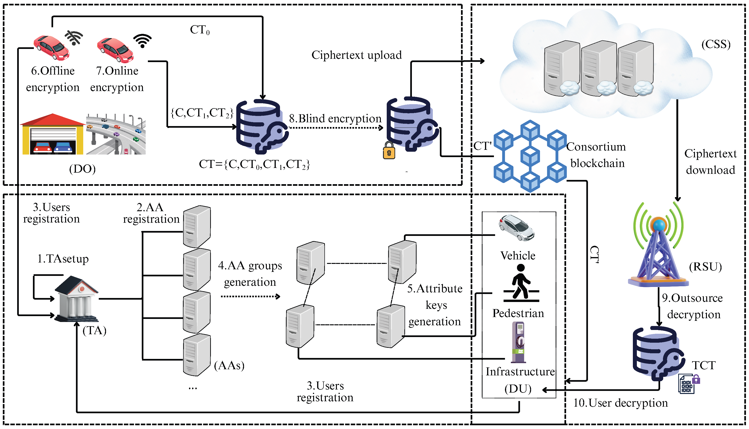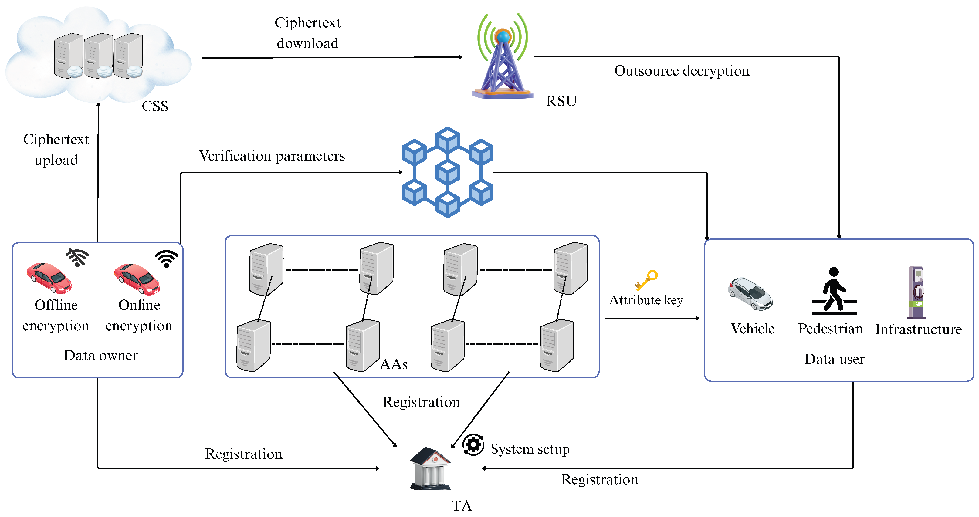 - Semi-Trusted CSS and RSU: The CSS and RSU are considered “honest-but-curious.” They will execute the protocol faithfully but may try to learn additional information from the ciphertexts or intermediate results they process.