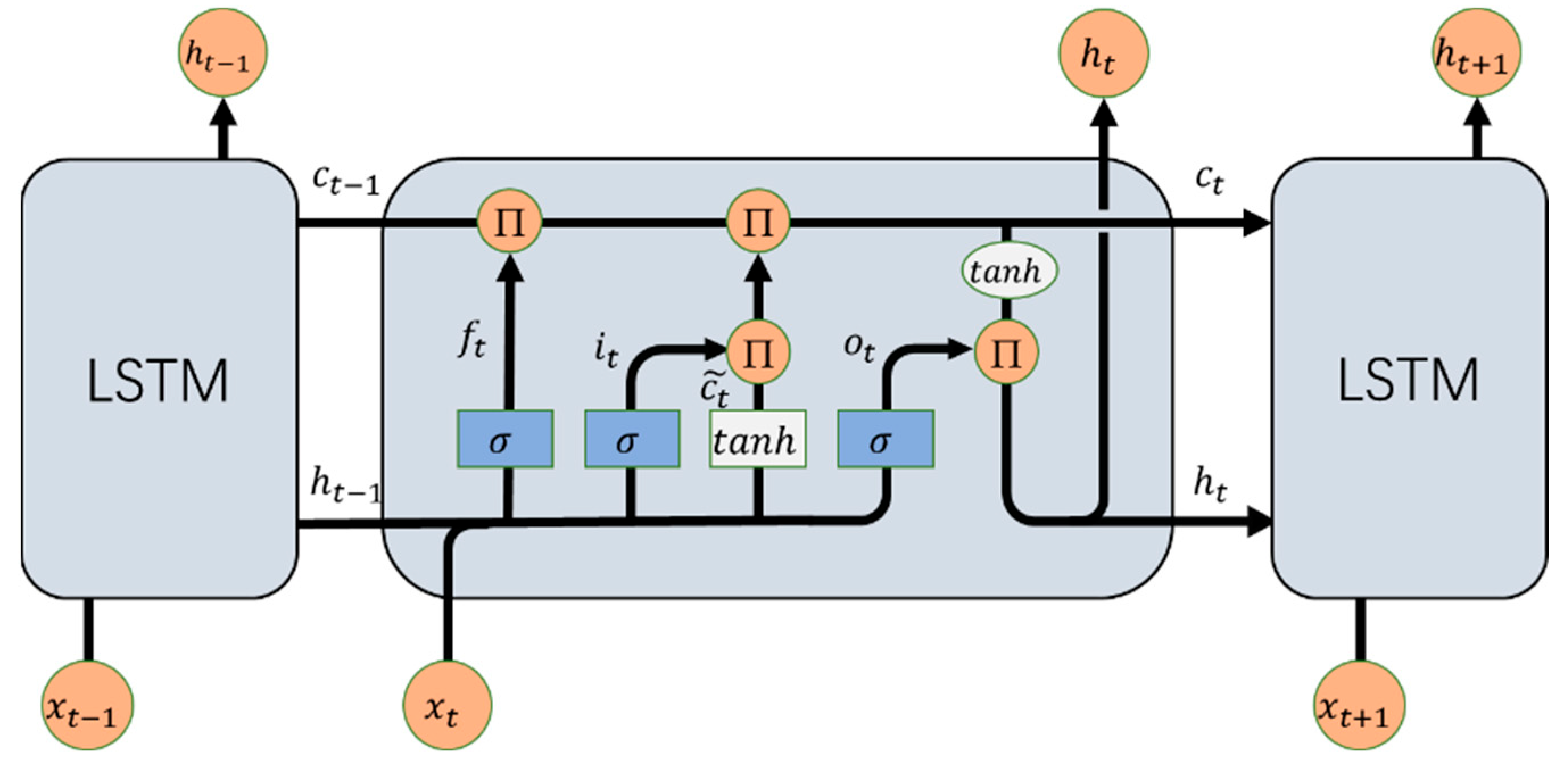 LSTM is a specialized type of recurrent neural network (RNN) designed to learn long-term dependencies. An LSTM network’s basic structure consists of an input layer, a core LSTM layer, and an output layer. Its key feature is within the LSTM layer, which is characterized by memory units and three dedicated gates (forget, input, and output) [31,32]. The architecture of the LSTM recurrent neural network is depicted in Figure 3. Leveraging its memory cells and gates, LSTM possesses the capability to capture long-range patterns in sequential data while simultaneously stabilizing gradient flow through dynamic information control, thereby effectively resolving the vanishing and exploding gradient problems.