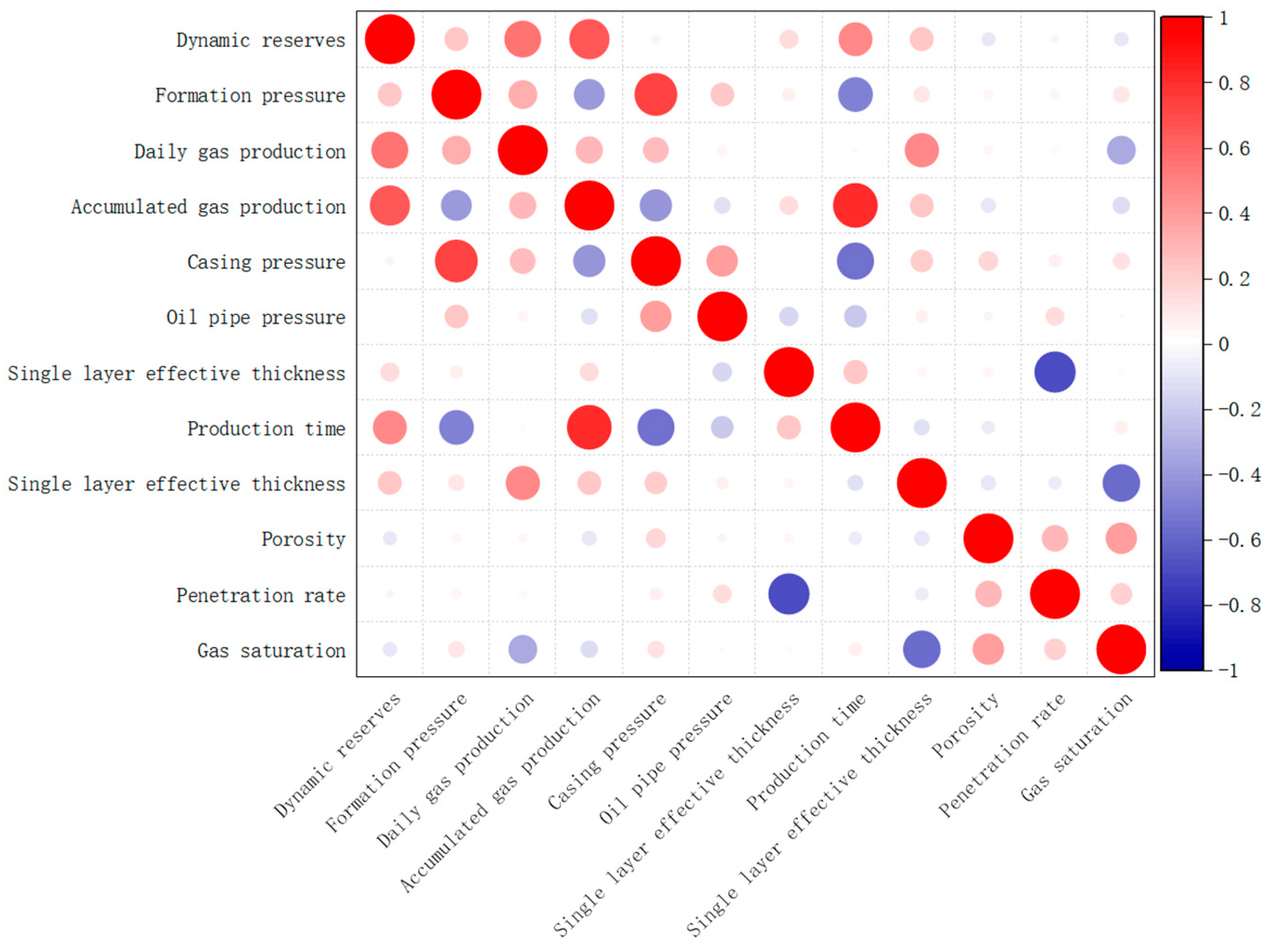 To identify key features and clarify the relationship between parameters and dynamic reserves, a Pearson correlation analysis was conducted. This step was crucial for screening input variables and improving the subsequent prediction accuracy of the model.