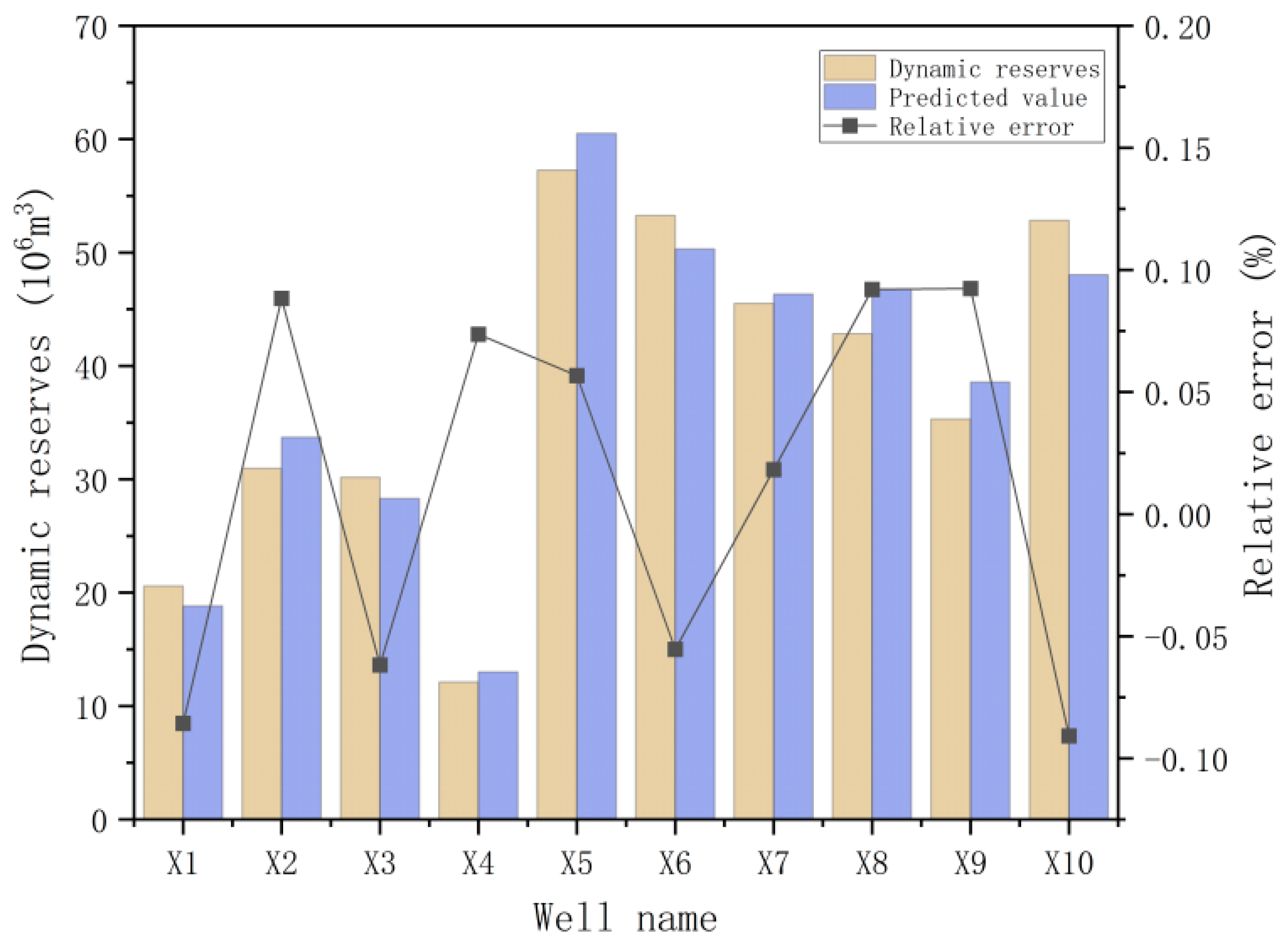 To further verify the predictive performance of the model, data from 10 wells that did not participate in the model training were re-collected in the study area and brought into the CNN-LSTM for training. For the newly selected wells, a certain level of relative error is observed between the model’s predictions and the actual dynamic reserves, as evidenced in Figure 7. Specifically, the relative error for all samples is controlled within a narrow range of −9.08% to 9.23%. This indicates that the model has good extrapolation accuracy and robustness, and its prediction error is strictly limited to a low, engineering-acceptable range. To further verify the accuracy and applicability of the dynamic reserve prediction model for tight gas wells based on deep learning.