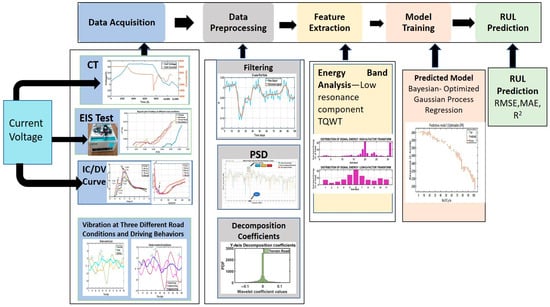 A vibration dataset with varying time series was obtained from the sensors mounted on the vehicles using a data acquisition system. Signals obtained in the time domain were converted to the frequency domain using DWT, and the Power Spectral Density (PSD) of the signal was obtained. Vibration Signals were preprocessed using DWT and denoised, and residual coefficient analysis was performed. Feature extraction was performed through TQWT. Energy band analysis of the vibration signal was performed to understand the distribution of the frequency band energy values of the signal. RUL prediction was performed based on vibration data acquired from the three different axes, the X-axis, Y-axis, and Z-axis. The BO-GPR method was used for RUL prediction based on the different axes of vibration signals, capacity degradation with different road conditions, and driving behavior, along with micro-climatic conditions.