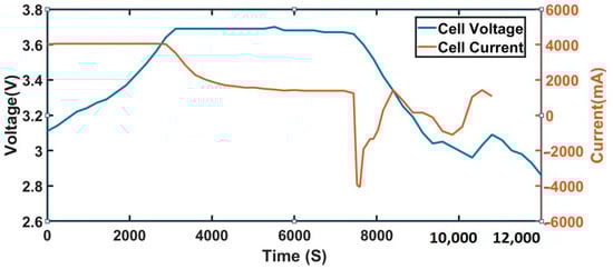 The capacity test was measured based on capacity of the battery. The battery was initially discharged by discharging a current of 1 C until the 3.0 V cut-off voltage. After 30 min of rest period, the battery was charged in a Constant Current–Constant Voltage (CC-CV) mode to reach a maximum voltage of 4.2 V, followed by Constant Voltage charging until the current dropped to 120 mA. This process was repeated three times, and the average of the three discharge capacities of the battery was considered as the actual capacity of the battery. Figure 4 shows the variation in charging and discharging current and voltage over a period of 3 h for a single cell. Measurements were performed in the lab at a room temperature of 30 °C, humidity of 49%, and wind speed of 9 km/h.
