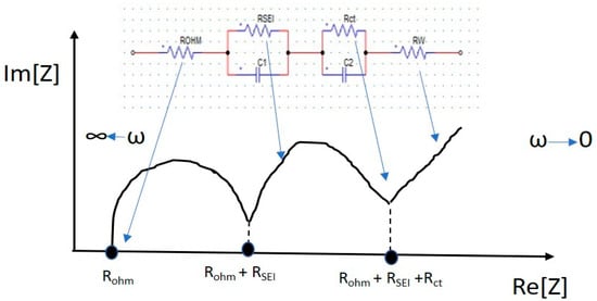 where Z(W) is Warburg impedance, σ is the Warburg coefficient, ω is angular frequency (rad/s), and j = . Warburg impedance is visible in the Nyquist plot as the straight line with a 45° angle to the abscissa, representing the diffusion of lithium ions within the electrode. The impedance is frequency-dependent and has equal real and imaginary components.