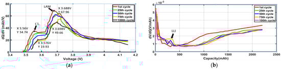 IC/DV curve test analysis is used in battery degradation studies for identifying lithium inventory loss, active material degradation, and electrode potential shifts over cycling. Tests were performed at 28 °C for 100 cycles. During each cycle, cells were discharged at a 0.5 C to 1 C rate, and the voltage and capacity data were collected at 1 Hz frequency. Accurate to 1 mV precise voltage measurements were taken, as well as capacity measurements with a resolution of 10 mAh. Phase transitions within the battery material correspond to a peak in the IC&DV curve. These peak shifts or decreases in magnitude indicate a loss in capacity or efficiency. Incremental capacity is calculated as a function of voltage and is mathematically represented as . Figure 7a represents the IC curve from the test conducted on Li-ion battery at different cycles.DV analysis is the inverse of IC analysis, expressed as . The shift in the IC curve towards a lower voltage is identified as CL, which correlates with collector corrosion or electrolyte decomposition within the battery. The peak variation difference in the IC curve is identified as LAM, which correlates with possible electrode decomposition, electrolyte oxidation, active particle denaturation, lithium dendrite formation, and disordered crystal structure inside the battery. Measurements were performed in the lab at a room temperature of 28 °C, humidity of 65%, and wind speed of 9 km/h.