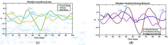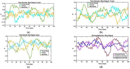 Denoised time domain vibration signals for different road conditions on the (a) X-axis, (b) Y-axis, and (c) Z-axis (d) for different driving behaviors.