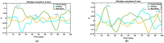 Vibration signals were measured through the accelerometer placed on the battery. Data was collected at a sampling frequency of 1 KHz. The sensor provided an analog output voltage proportional to acceleration, with a measurement range of ±3 g and sensitivity of approximately 300 mV/g for each axis. Three different cases of road conditions were tested for this study: a pan-shaped pothole, gravel-stabilized mud road seen in urban areas, and urban terrain road. The vehicle was operated under controlled driving conditions across three distinct road types to evaluate vibration behavior: Each road segment was approximately 500 m in length, and the vehicle was driven at a constant speed of 25 km/h to maintain uniform dynamic loading conditions. Environmental parameters, such as temperature, humidity, and wind speed, were recorded simultaneously using a DHT22 sensor and an Adafruit cup-type Model 1733 anemometer to correlate with micro-climatic effects on vibration response. Each test lasted for 100 min per road type, with 40 test runs covering 40 Km in total. Vibration signals are time domain signals represented for three different road conditions in the X-, Y-, and Z-axes, as shown in Figure 8a–c. The vibration signals were recorded for different driving behaviors [,,]—smooth driving, inattentive driving, and aggressive driving—as shown in Figure 8d. Measurements were taken on the road at a temperature of 38 °C, humidity of 49%, and wind speed of 16 Km/h.