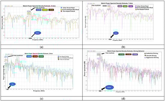PSD for different road conditions for (a) X-axis (b) Y-axis (c) Z-axis and (d) PSD for different driving behaviors. * indicates peak amplitude.