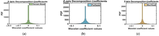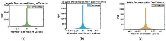 Decomposed coefficients in X-axis: (a) Terrain Road, (b) Pothole, (c) Mud Road (battery vibration).