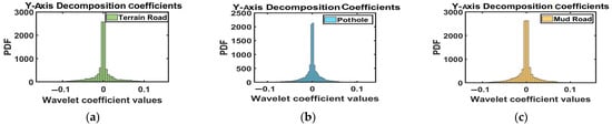 Higher frequency components were disregarded as they fall outside the reliable Nyquist band for the chosen sampling rate. This choice also reduces data storage requirements and computational complexity, making the acquisition more practical for real-time, on-road testing scenarios []. High-frequency lateral vibrations are likely to aggravate ohmic and charge-transfer resistances through micro-cracking and loss of electrical contact, whereas low-frequency vertical oscillations contribute to loss in active material and accelerated aging through cyclic compressive stress. Thus, the integration of axis-specific vibration features provides a more comprehensive understanding of RUL prediction under real-world driving conditions. The decomposed coefficients are shown for the urban terrain road, gravel-stabilized mud road, and pan-shaped pothole, along the X-axis, Y-axis, and Z-axis of vibrations, shown in Figure 11, Figure 12 and Figure 13.