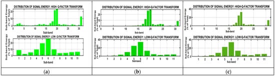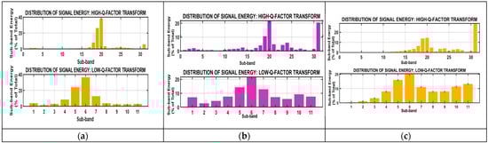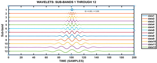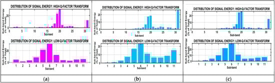 Figure 14 shows the TQWT wavelet base for different sub-bands 1 to 17. The TQWT provides frameworks for analyzing energy distribution across different frequency bands within a signal. The TQWT satisfies Parseval’s theorem and ensures the total energy of the wavelet coefficients equals the energy of the original signal. This ensures no information is lost during transformation. The test result values of the TQWT were Q-factor = 4, r = 3, α = 0.867, and β = 0.4. Sub-band energy graphs are shown in Figure 15, Figure 16 and Figure 17 for the three different axes at the three different road conditions. The objective function shown in (11) aims to minimize the reconstruction error between the original signal x and its decomposed components, represented by the high resonance and low resonance bases and, respectively. The first term enforces fidelity to the original signal, while the second term imposes sparsity through the L1-norm regularization weighted by [].