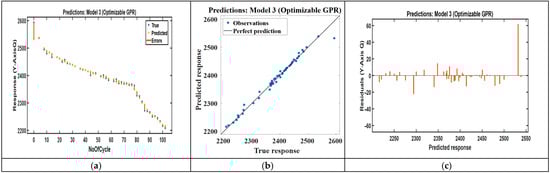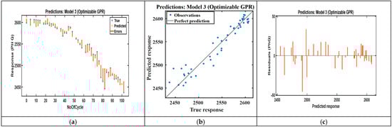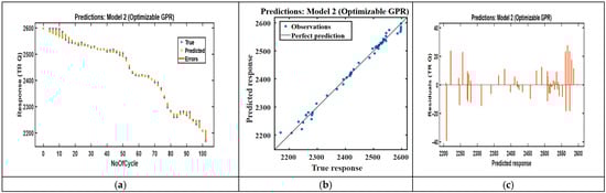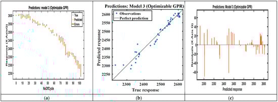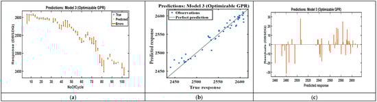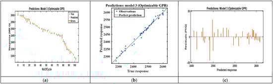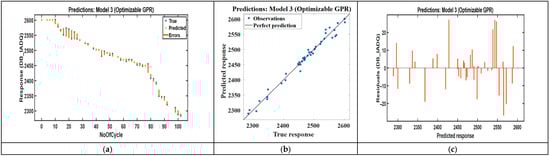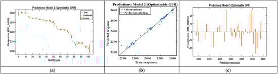 Recent studies using conventional machine learning methods report lower performance for standard battery datasets. CEEMDAN-WOA-SVR [] and the random forest regression model report substantially larger RMSE values than our BO-GPR model does [], and optimized random forest methods typically show goodness-of-fit values in the mid-90% range [,]. These results indicate that the BO-GPR method yields an improved predictive performance on average 98.1% under real-world vibration and micro-climatic variability, as shown in Table 5.