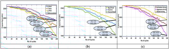 Variation in battery capacity degradation (a) along X-, Y-, and Z-axes (b) with road conditions, and (c) with driving behavior.