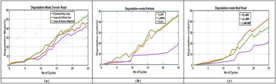 Degradation modes CL, LLI, and LAM for (a) urban terrain road, (b) pan-shaped pothole, and (c) gravel-stabilized mud road.