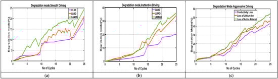 Degradation modes CL, LLI, and LAM for (a) smooth driving, (b) inattentive driving, and (c) aggressive driving.