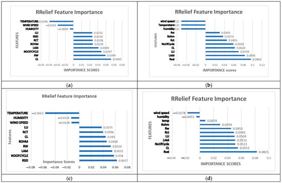 Feature importance graphs: (a) Z-axis, (b) X-axis, (c) urban terrain road, (d) Aggressive Driving.