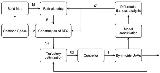 The overall architecture of the symmetric UAV cooperative transportation system is depicted in Figure 1. The process begins with the construction of a grid map of the confined space. A reinforcement learning-based Bi-RRT algorithm then generates a feasible path, followed by the construction of a Safe Flight Corridor (SFC) via convex decomposition. Finally, the optimal trajectory for the controller is obtained by solving an optimization problem.
