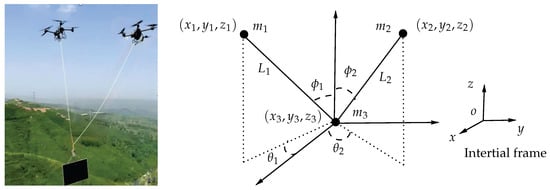 The physical model and coordinate system of the symmetric UAV cooperative transportation system are illustrated in Figure 2, where denotes the inertial frame. The positions of the symmetric UAVs, UAV1 and UAV2, are denoted as and , respectively, and the payload position is denoted as .