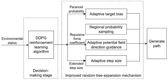 To enhance the adaptability and flexibility of the algorithm in environments of varying complexity, this paper proposes a reinforcement learning-supported DB-BiRRT (RLDB-BiRRT) method, which integrates a learning module to dynamically generate key parameters during node expansion. The overall framework is illustrated in Figure 3.