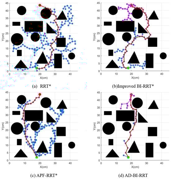 To evaluate the performance of the RLDB-BiRRT algorithm, three benchmark sampling-based algorithms were selected for comparison: the classic RRT* [], Improved Bi-RRT* [], and APF-RRT* []. These algorithms were tested on identical obstacle maps to ensure a fair and comprehensive performance comparison. For all compared algorithms, the maximum number of iterations was set to 2000, with a fixed step size of 1.75 units, a maximum connection distance of 5 units, and a rewiring radius of 5 units for RRT*-based optimizations.