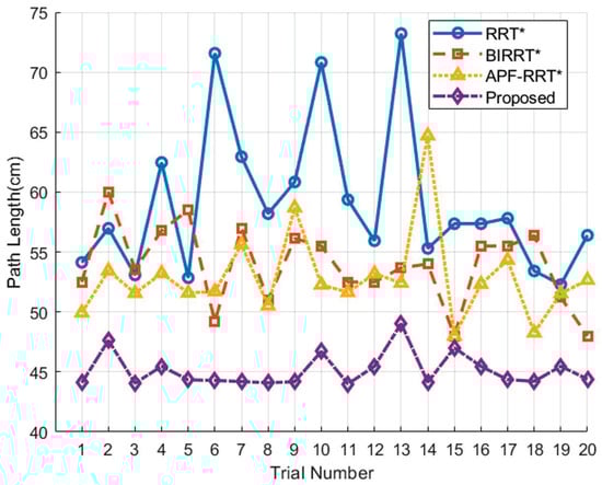 The simulation results of the four algorithms are qualitatively compared in Figure 5. Twenty independent Monte Carlo trials were conducted for each algorithm to ensure statistical significance. The runtime, path length, and number of nodes were recorded for each trial. The statistical results for computation time and path length are summarized in Figure 6 and Figure 7, respectively. The results indicate that the proposed RLDB-BiRRT algorithm achieves a favorable balance between planning efficiency (time) and path quality (length), consistently outperforming the benchmark algorithms in these key metrics across diverse environmental configurations.
