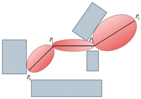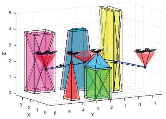 The adaptive safe corridor shown in Figure 11 effectively meets the obstacle avoidance requirements in complex environments, ensures the spatial continuity between path segments, and enhances the trajectory safety of the symmetric UAV cooperative transportation system.