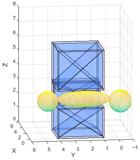Simulations of the symmetric UAV transportation system were performed in MATLAB. The environment simulates a scenario requiring navigation through obstacles, represented as a point cloud distributed within a workspace. This setup models the process of symmetric UAVs cooperatively transporting a payload through obstacles in a complex setting. The obstacles consist of three stacked cuboids, forming a narrow passage through which the system must navigate. A simulation model for the symmetric UAV cooperative payload transport was also established, incorporating the dynamic model developed in Section 2.