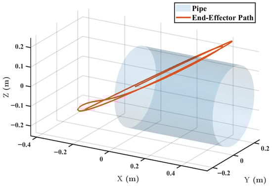 To validate the effectiveness and performance of the proposed adaptive robust control strategy, numerical simulations were conducted for the 2-DOF pipe-crawling robot (axial motion and manipulator motion ) developed in Section 2. The simulations were implemented in a MATLAB 2021b environment, considering significant parametric uncertainties, unmodeled dynamics (friction), and external time-varying disturbances. The robot is tasked with navigating along a pipe inclined at while its manipulator executes a prescribed motion. The resulting path of the end-effector in the three-dimensional workspace is depicted in Figure 3, which provides a visual overview of the simulation task.