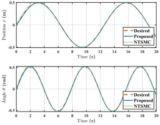 The simulation was run for 20 s. The results are presented in Figure 4, Figure 5, Figure 6, Figure 7 and Figure 8, with quantitative performance metrics summarized to support the analysis. To rigorously validate the performance of the proposed integrated controller, a comparative simulation was conducted against the conventional Non-singular Terminal Sliding Mode Controller (NTSMC) presented in []. Both controllers were simulated under identical conditions, including the same trajectory, parametric uncertainties, and external disturbances.