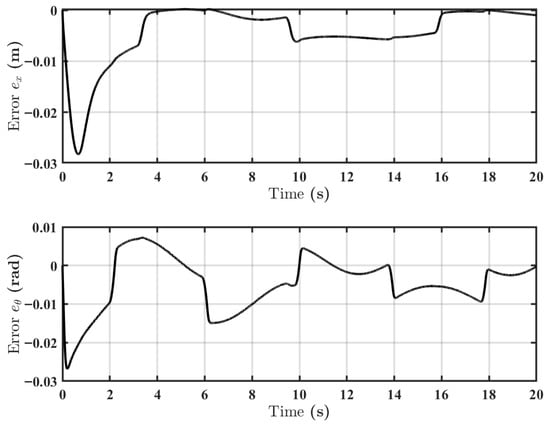 A more detailed quantitative analysis is provided by the tracking errors shown in Figure 5. The controller achieves rapid convergence and high steady-state accuracy. For the axial motion, the error settles within a m tolerance band in just 0.35 s, with the steady-state error (for s) maintained below m. The manipulator angle exhibits similar performance, converging within a rad tolerance in 0.42 s, and its steady-state error is confined to rad. These low error magnitudes quantitatively confirm the controller’s ability to achieve high-precision tracking despite significant uncertainties.