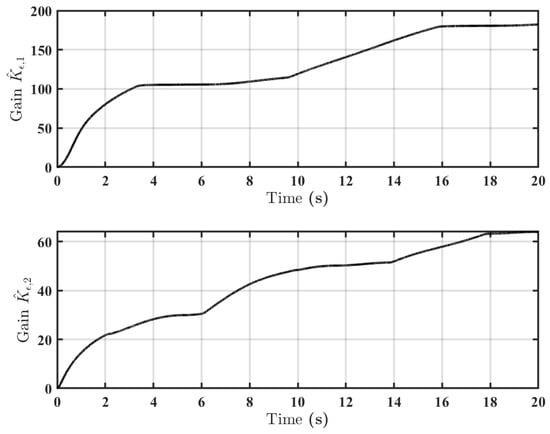 Finally, Figure 8 illustrates the evolution of the adaptive gains. The gains, and , increase initially to counteract the system’s uncertainties and then converge to stable, finite values as the tracking error diminishes. This behavior confirms that the adaptive law effectively adjusts the control effort to the required level without causing unbounded gain growth, thereby ensuring the stability of the closed-loop system.