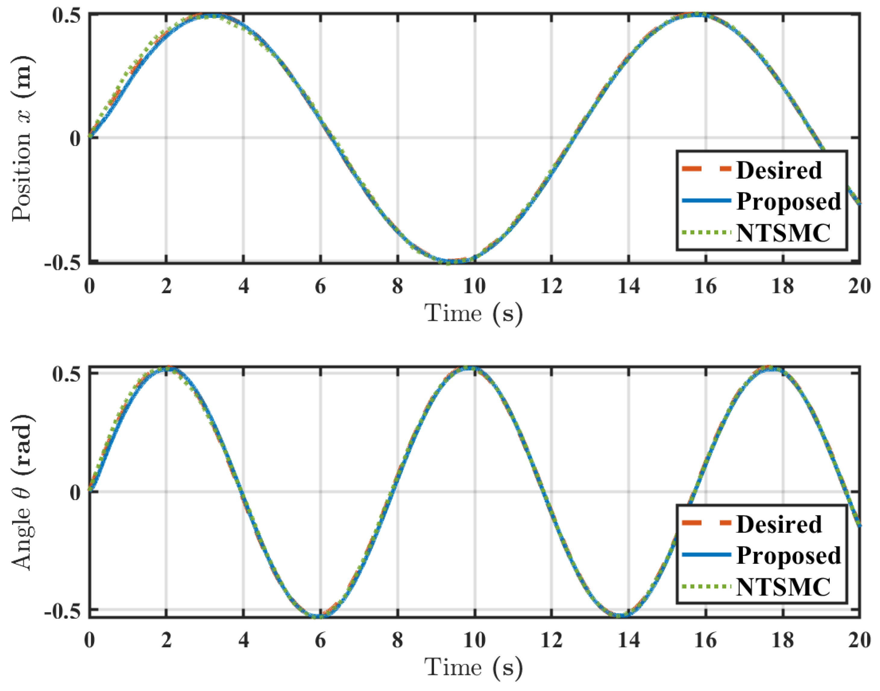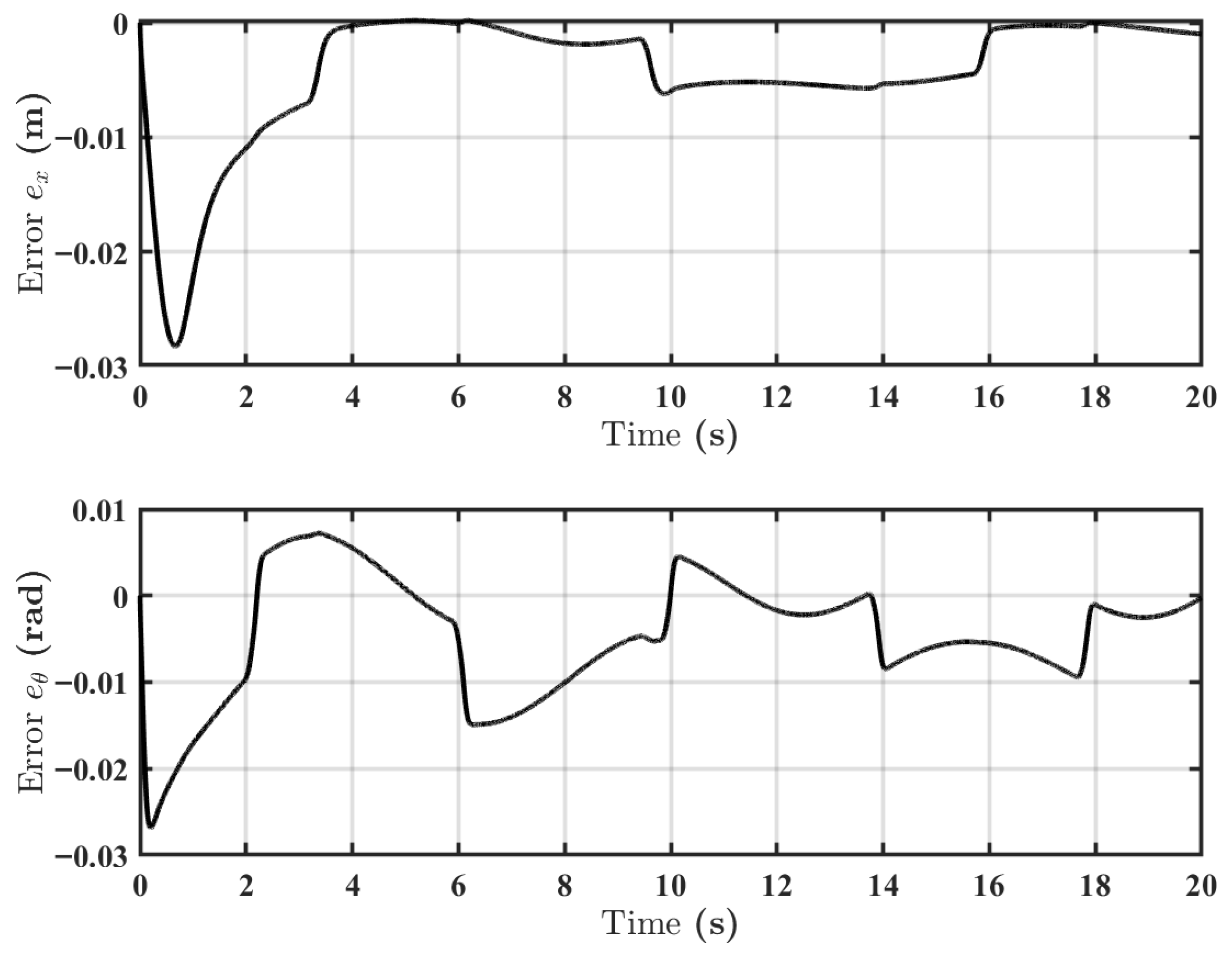 Figure 4 shows the trajectory tracking performance for both the axial position ( x ) and the manipulator angle ( θ ). It is visually apparent that the actual trajectories (solid blue lines) closely follow the desired paths (dashed red lines), demonstrating the fundamental effectiveness of the control law. As shown in Figure 4, while both methods are capable of tracking the desired trajectory, the “Method in [15]” (dotted green line) exhibits a noticeably larger tracking error and a slower transient response, particularly at the 5 s and 10 s mark where the reference velocity changes direction. In contrast, our proposed method (solid blue line) demonstrates superior precision and robustness, maintaining a significantly tighter tracking performance throughout the simulation. This comparison validates the effectiveness of our integrated framework in handling the compound uncertainties.