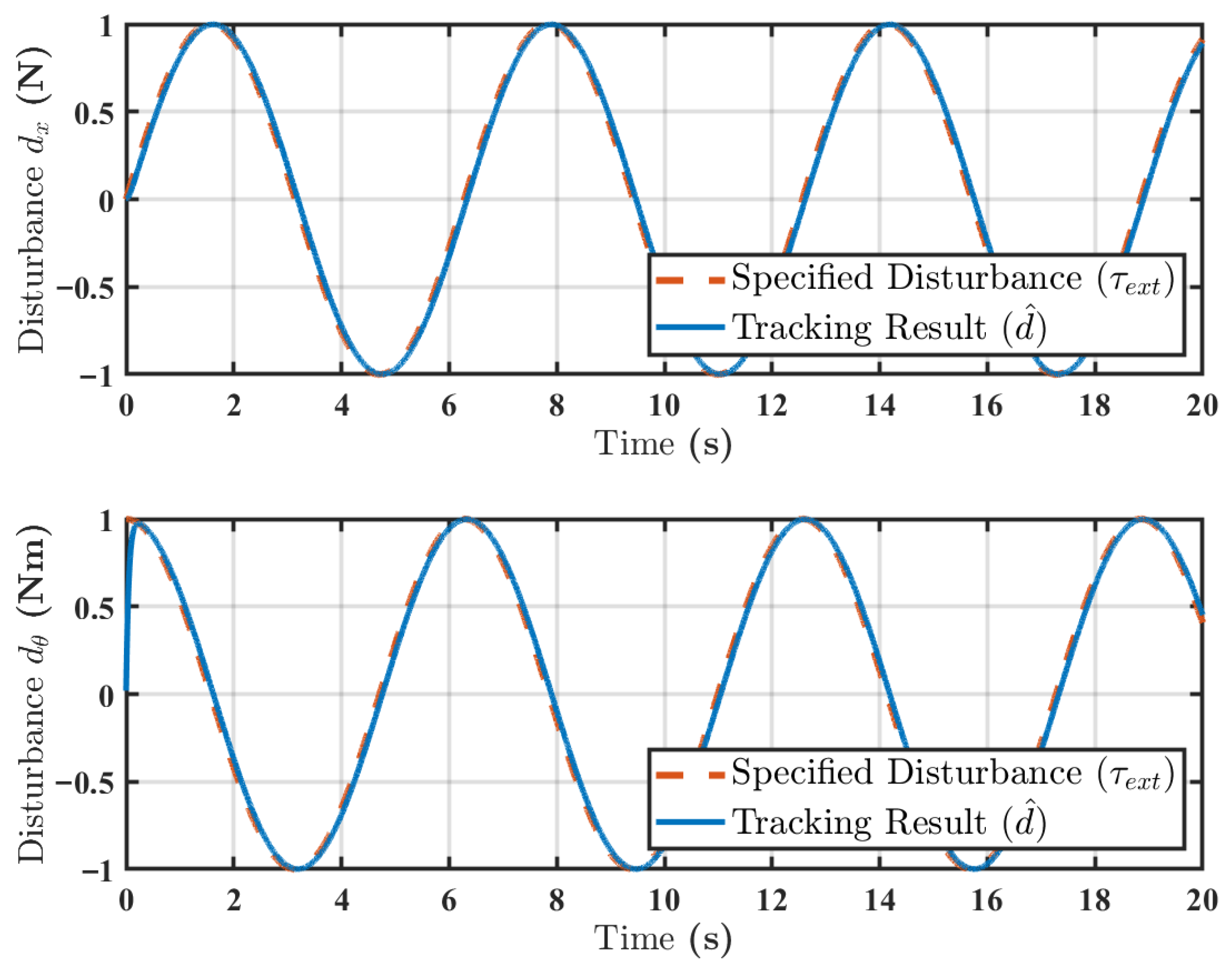 In this study, the disturbance observer is specifically configured to track this known external disturbance component, τ e x t ( t ) , to evaluate its tracking performance under the given parameters.