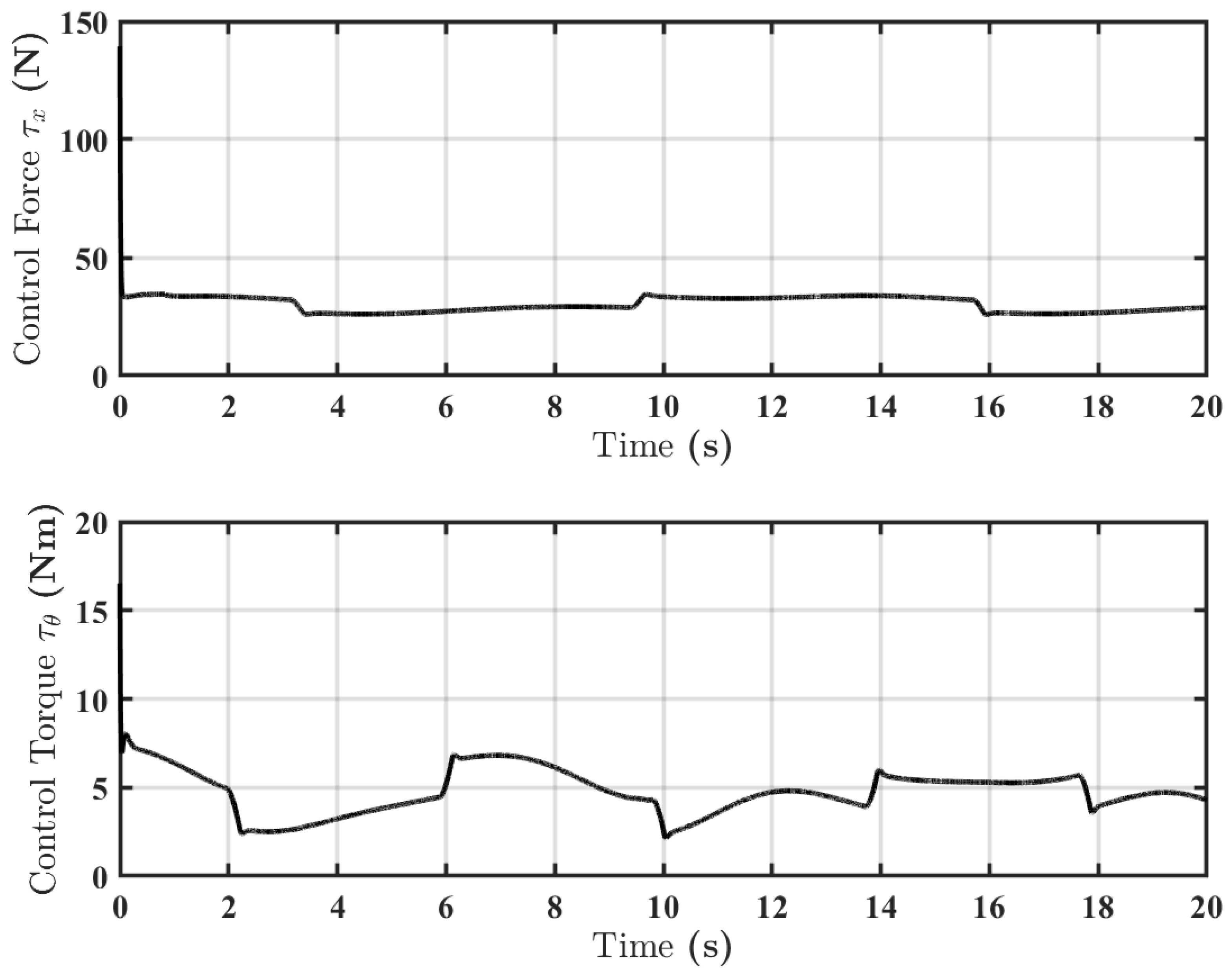 The control inputs are shown in Figure 7. The axial force and joint torque are smooth and continuous, confirming that the boundary layer technique effectively mitigates chattering. The inputs remain well within the predefined saturation limits of ± 100 N and ± 50 Nm.