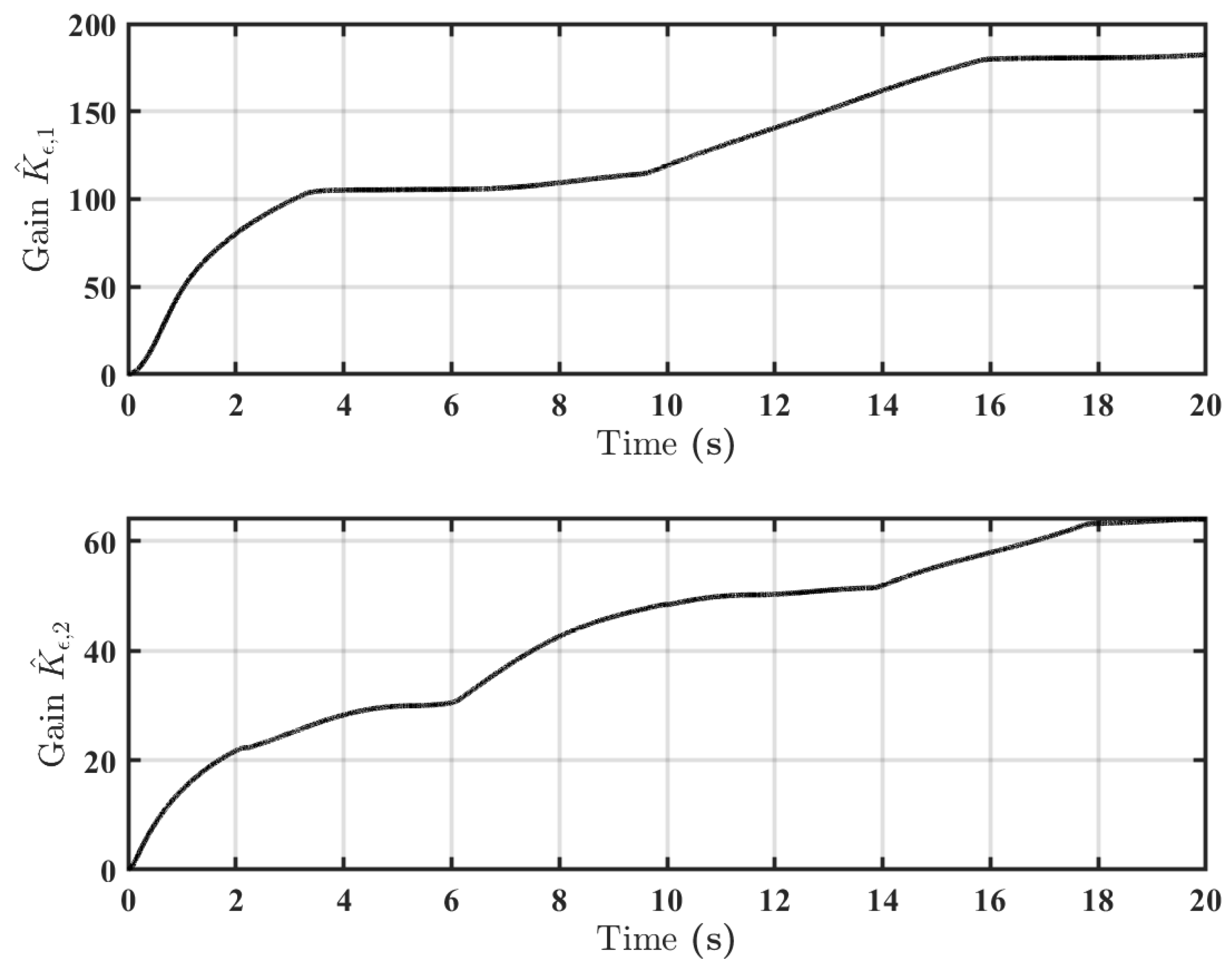 Finally, Figure 8 illustrates the evolution of the adaptive gains. The gains, K ^ ϵ , 1 and K ^ ϵ , 2 , increase initially to counteract the system’s uncertainties and then converge to stable, finite values as the tracking error diminishes. This behavior confirms that the adaptive law effectively adjusts the control effort to the required level without causing unbounded gain growth, thereby ensuring the stability of the closed-loop system.