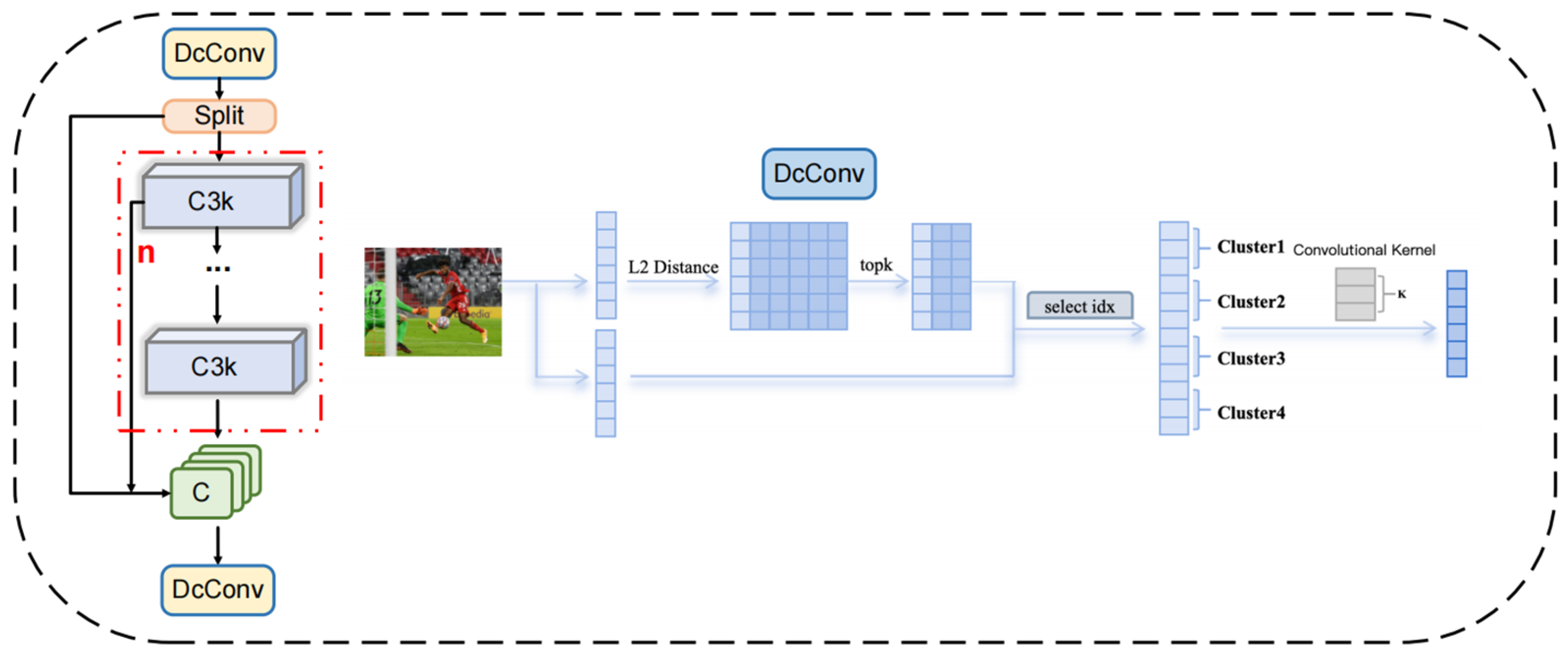 Furthermore, to alleviate the computational burden introduced by dynamic clustering at high-resolution image scales, this study adopts an efficient dynamic clustering strategy. Specifically, by employing interval sampling on feature vectors, the dimensionality involved in distance calculations is reduced, significantly decreasing the computational complexity inherent to dynamic clustering. Thus, the module achieves global semantic capture capability within an acceptable computational cost. Through the design outlined above, the proposed DCC3K2f module effectively expands the receptive field of the network, transitioning from a fixed local window to a globally adaptive semantic window, significantly enhancing the model’s capacity to capture long-range dependencies. This method effectively extracts semantic correlations between football targets and their contextual surroundings.