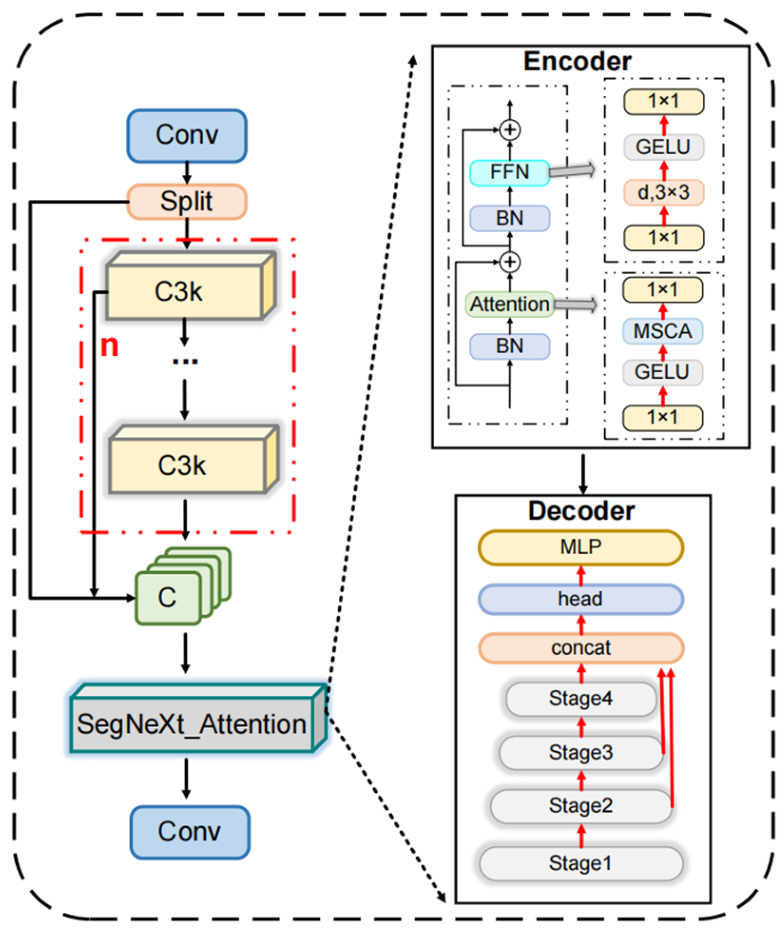 To further enhance global context modeling and reduce background interference, we design the SNAC3k2 module as the neck of Football-YOLO. SNAC3k2 is built on the SegNeXt attention mechanism and integrates a lightweight “hamburger” structure to capture both local and global information with low computational cost [